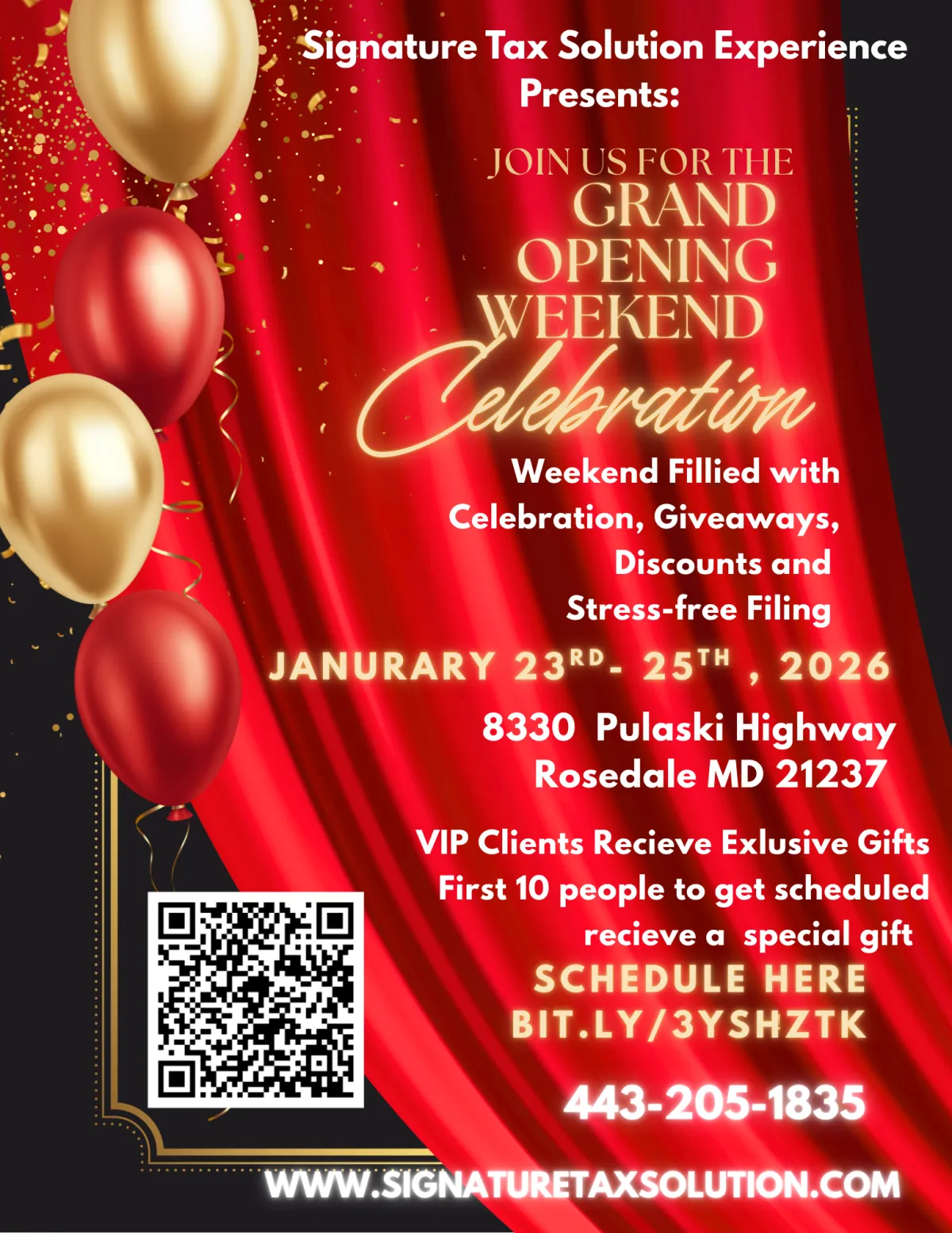 We’re officially opening our doors and kicking off tax season with a weekend full of celebration, excitement, and exclusive perks! Join us for our Signature Tax Solution Experience Grand Opening Weekend, where we’re celebrating YOU and the start of an amazing tax season. Expect giveaways, discounts, raffles, and surprises all weekend long! Our VIP clients will receive special gifts, and the first 10 people who get scheduled will receive an exclusive bonus gift just for showing up early. This is more than a grand opening — it’s an experience! Whether you’re a new client or returning, this weekend is all about connecting, celebrating, and getting ready for a stress-free tax season with confidence. Must be on our VIP List to receive some of our exclusive offers. Join our VIP LIST today!